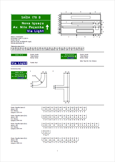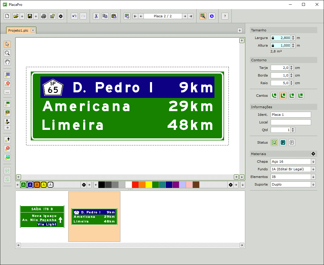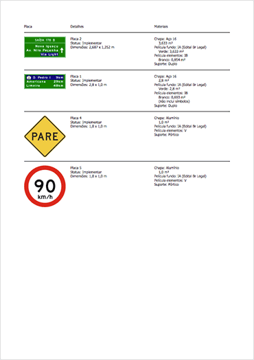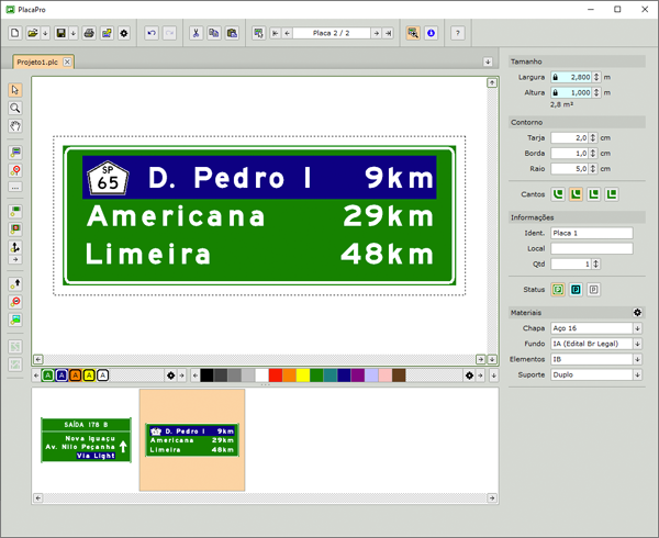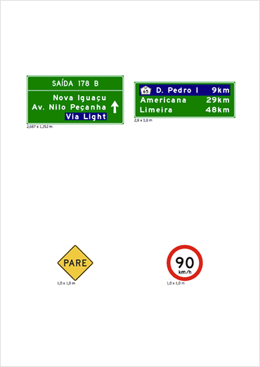 Você pode criar placas complexas com apenas alguns cliques de mouse. O programa calcula as medidas automaticamente, de acordo com as normas de sinalização (DER SP, CONTRAN, Guia Brasileiro de Sinalização Turística).