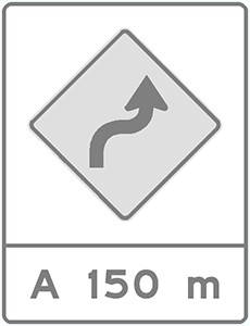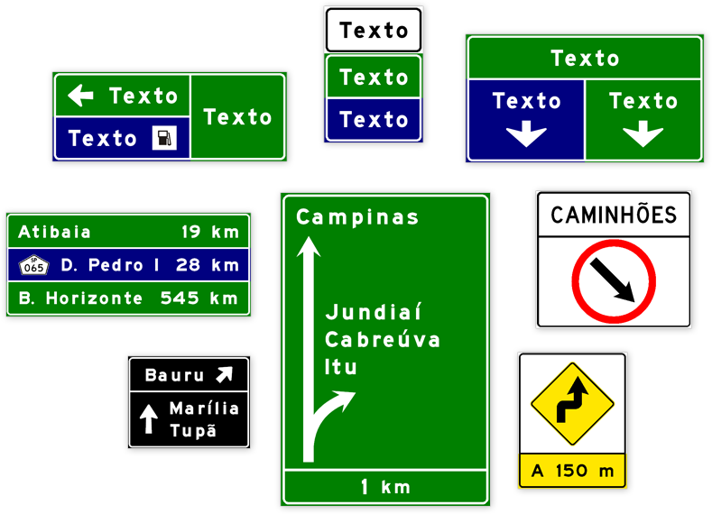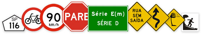 Setas e símbolos de regulamentação, advertência, escudos, turismo e outros.